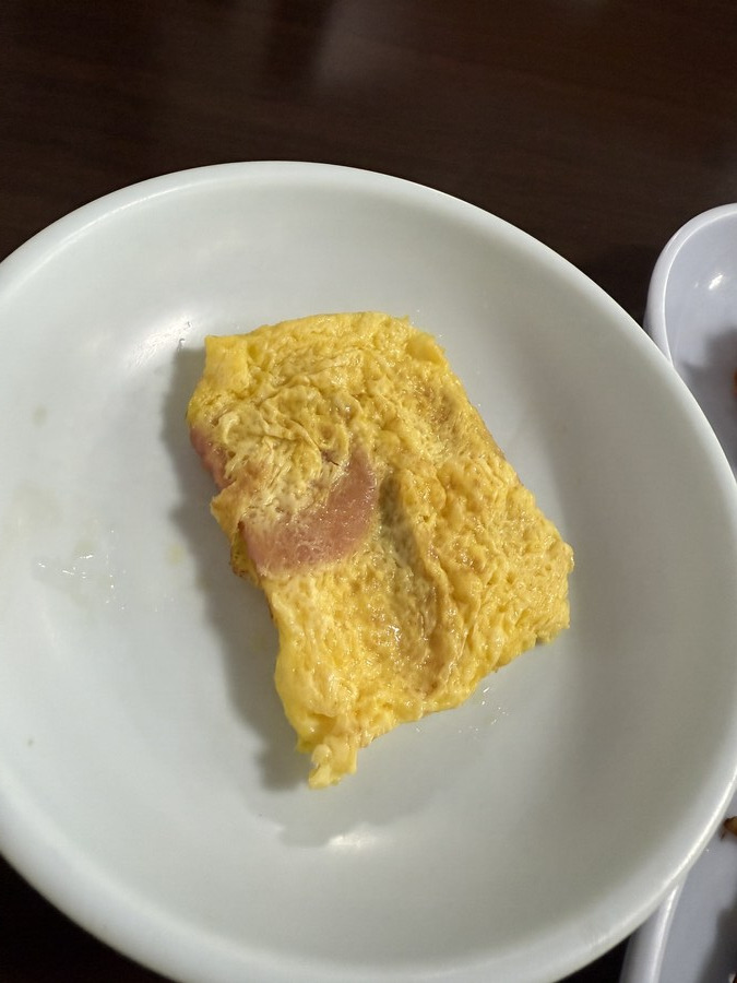 이것은 소세지 부침인가 계란 부침에 소세지가 반틈 묻은 것인가 (간이 적절해서 맛있음~.)