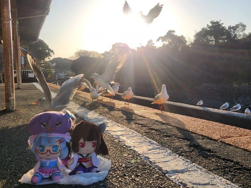 역에 열차가 들어올때 열차를 피해 나는 갈매기들과 우나핏피고, 유루캠 랩핑열차를 찍는게 목표다
