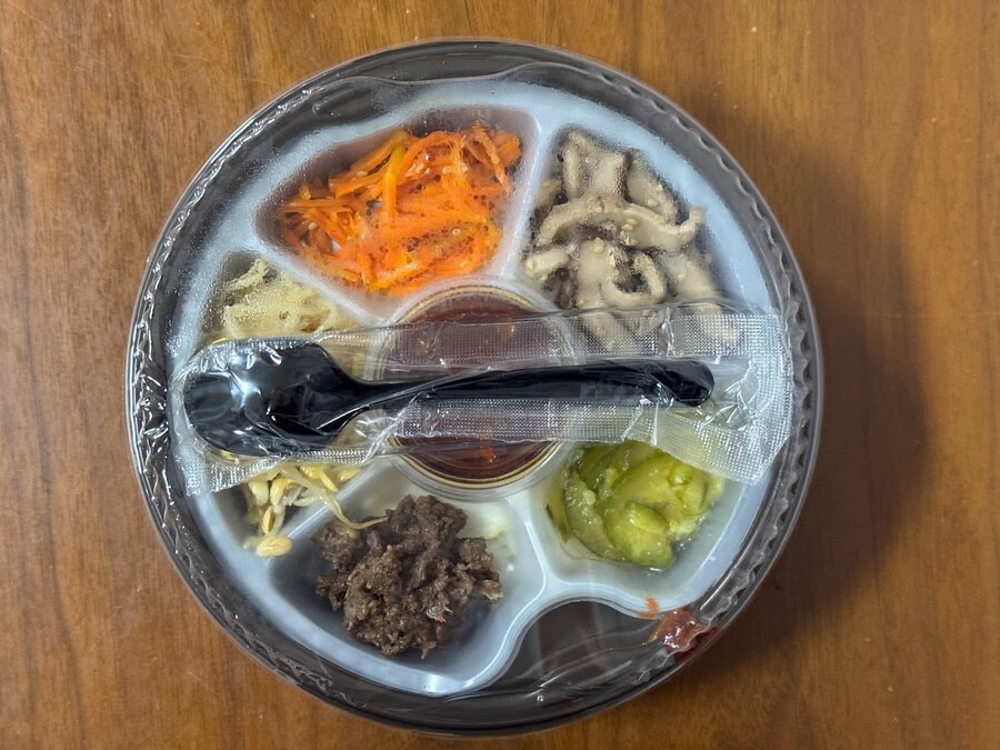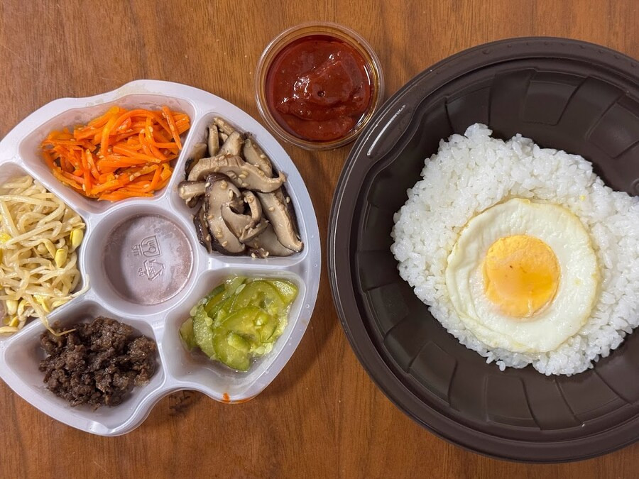평범한 비빔밥 구성인데 고기가 소고기고 불고기 양념에 볶았다는 게 특징이겠네요.