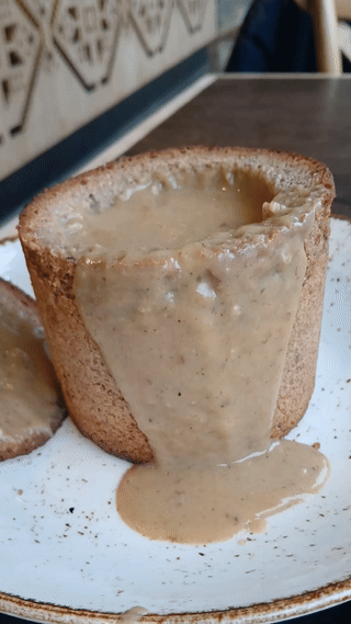 흑빵에 가운데를 파서 그 자리에 버섯과 걸죽한 스프를 넣은것!!