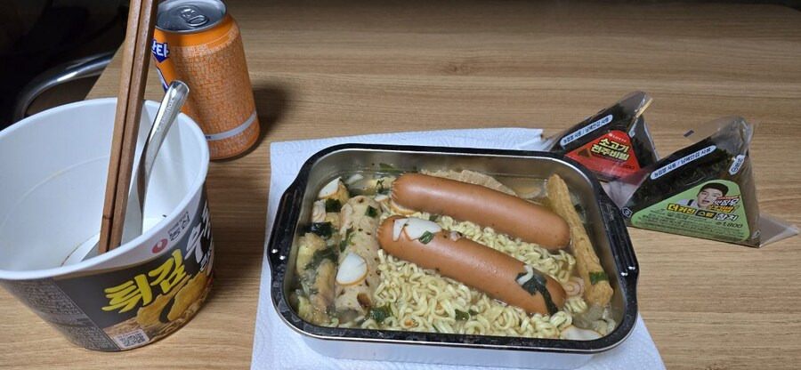gs랑 같이 콜라보 로 의성 마늘 소세지2개랑 삼각 2개 환타 그리규 튀김우동으로 만들어