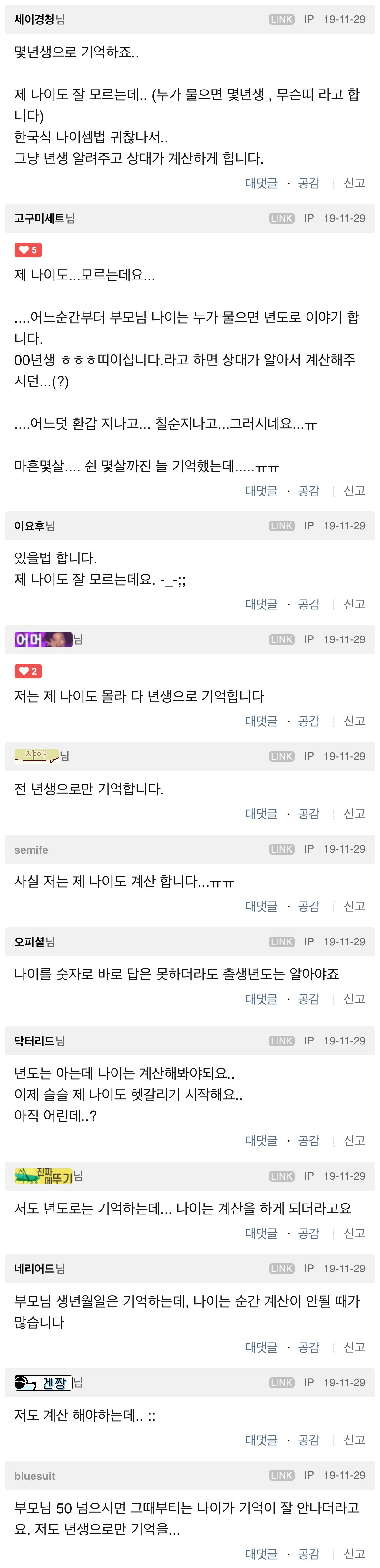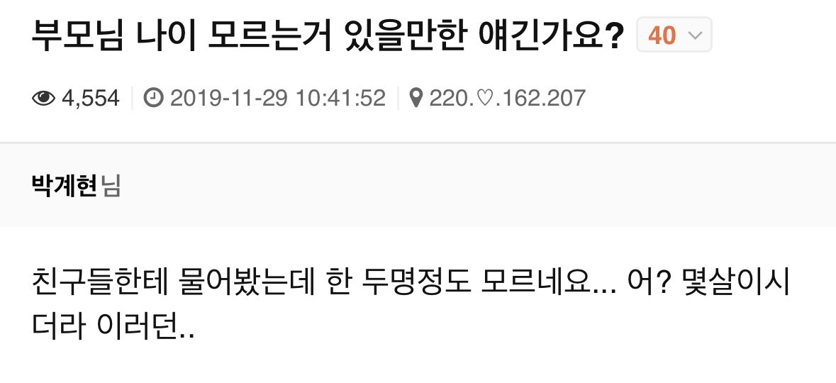 비회원 이슈 0 2 5시간전 부모님 나이 모르는 거 있을만한 얘긴가요?... jpg 이제 내 나이도 년도로 기억하는데........... 출처 : https://m.bboom.naver.com/best/get?boardNo=9&postNo=4353846 이 글을 SNS로 공유하기