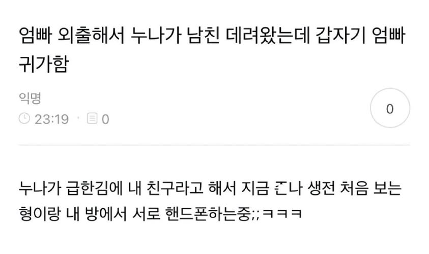 비회원 이슈 0 8 3시간전 엄빠 외출해서 누나 남자친구 데려왔는데 갑자기 엄빠 귀가함.jpg 동생분 착함 ㅋㅋㅋㅋㅋㅋㅋㅋㅋㅋㅋ 출처 : https://m.bboom.naver.com/best/get?boardNo=9&postNo=4354084 이 글을 SNS로 공유하기