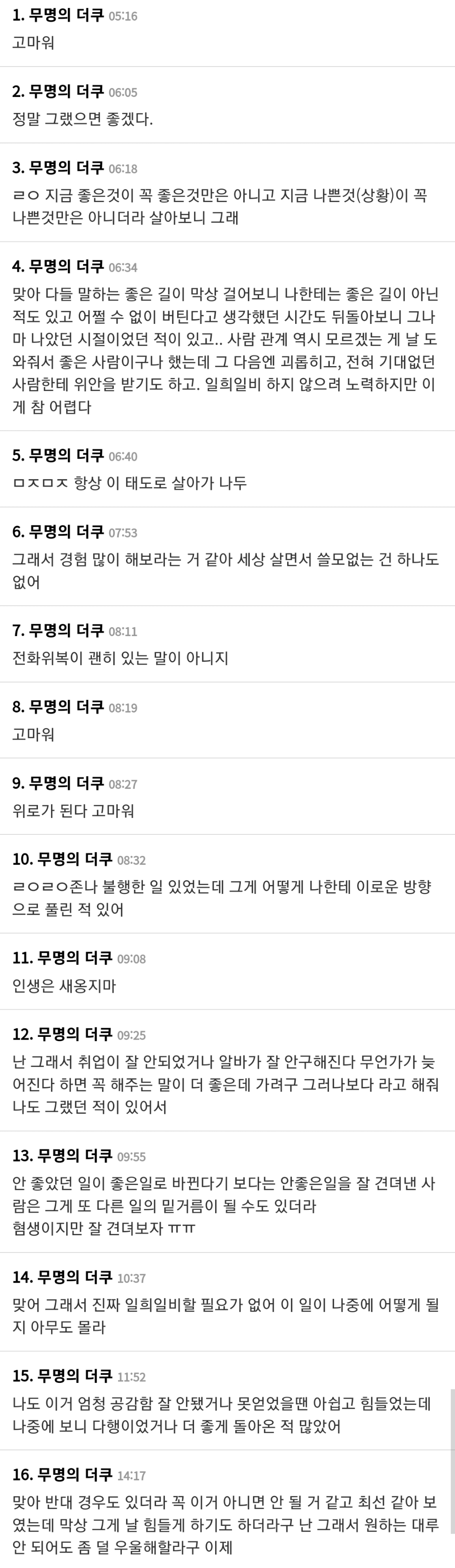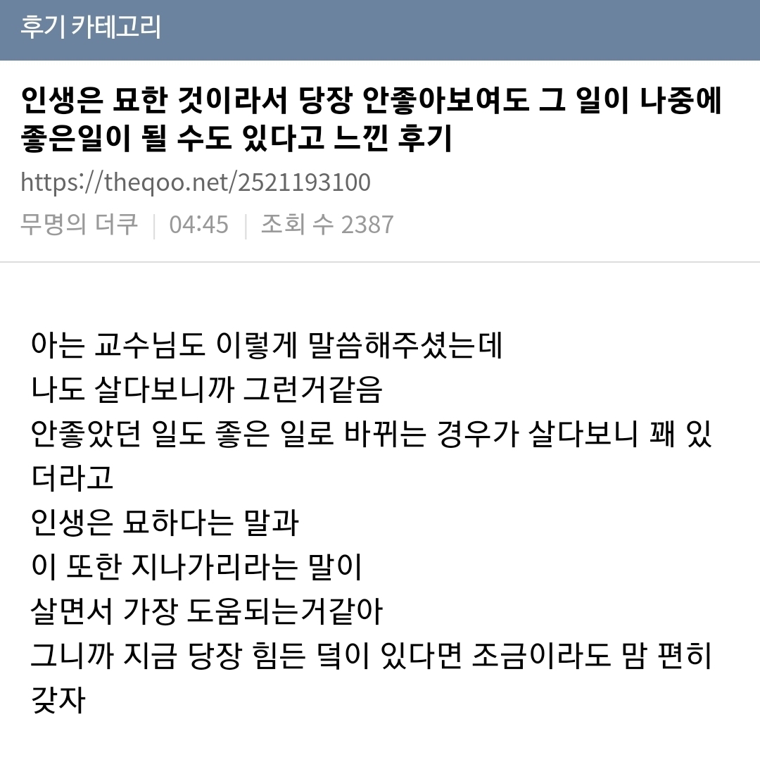 비회원 이슈 0 7 3시간전 인생은 묘한 것이라서 당장 안좋아보여도 그 일이 나중에 좋은일이 될 수도 있다고 느낀 후기 진짜 죽을거 같이 힘든 경험이 저한테 가장 필요한 일이 되기도 하더라구요 가장 어두운 시기를 걷고 계신 모든 뿜러들 내일은 반짝이는 하루가 되기를 바랍니다~ 출처 : https://m.bboom.naver.com/best/get?boardNo=9&postNo=4351662 이 글을 SNS로 공유하기