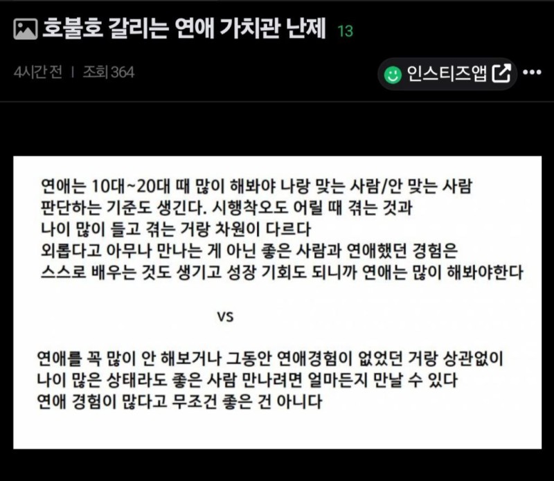 비회원 이슈 0 1 14시간전 호불호 갈리는 연애 가치관 난제 전 전자요 경험이 있어야 사람 대하는 센스나 마음가짐이 다름 진짜 출처 : https://m.bboom.naver.com/best/get?boardNo=9&postNo=4357362 이 글을 SNS로 공유하기