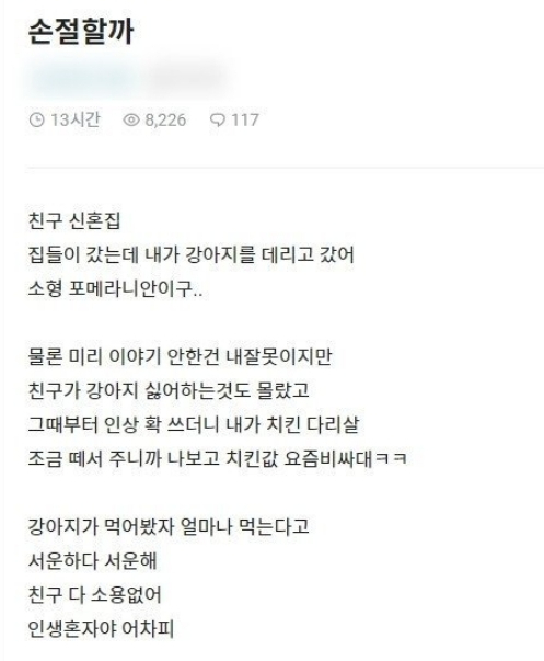 비회원 이슈 0 50 09.29 17:00 친구 신혼집에 강아지 데려가 손절 고민중 친구분이 얼른 손절하셔야겠네 출처 : https://m.bboom.naver.com/best/get?boardNo=9&postNo=4331035 이 글을 SNS로 공유하기