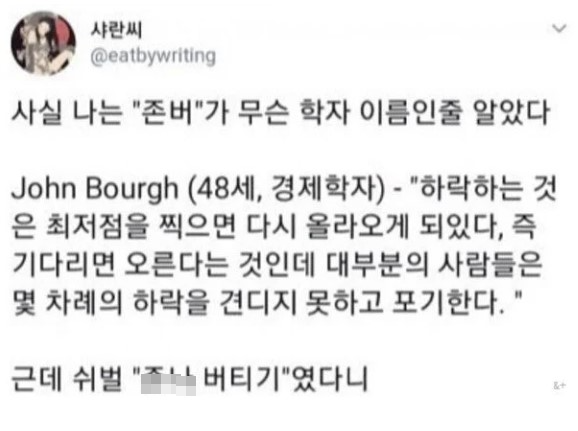 비회원 이슈 0 24 09.30 07:00 존버 뜻.jpg ???????????????????????????????????????? 출처 : https://m.bboom.naver.com/best/get?boardNo=9&postNo=4331153 이 글을 SNS로 공유하기