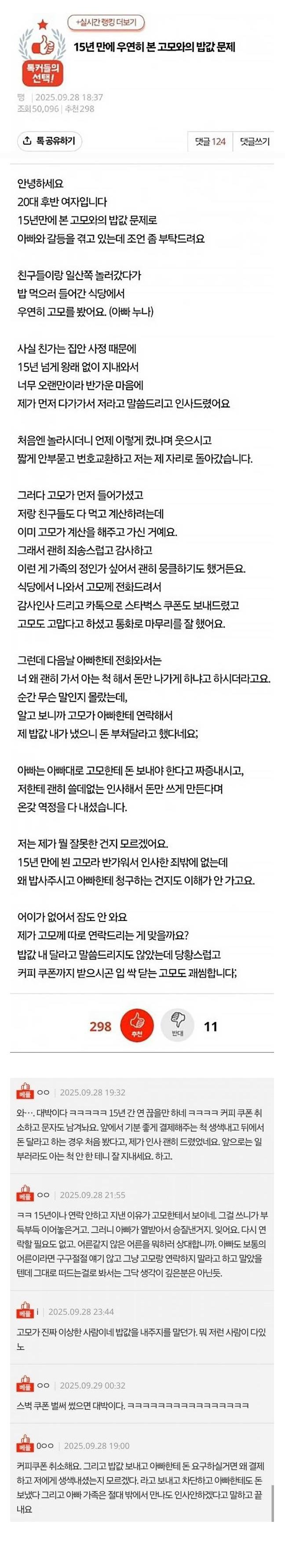 비회원 이슈 0 29 10.01 17:00 15년만에 우연히 본 고모와의 밥값 문제 출처 : https://m.bboom.naver.com/best/get?boardNo=9&postNo=4336129 이 글을 SNS로 공유하기