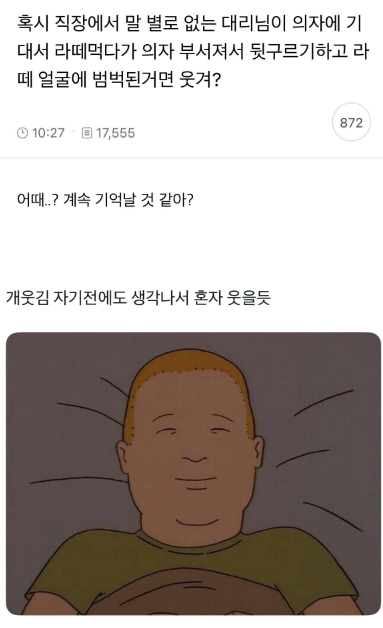 비회원 이슈 0 22 10.01 17:00 혹시 직장에서 말 별로 없는 대리님이... 안쓰러움 반 웃김 반일듯요 ㅋ쿠ㅜ 출처 : https://m.bboom.naver.com/best/get?boardNo=9&postNo=4333017 이 글을 SNS로 공유하기