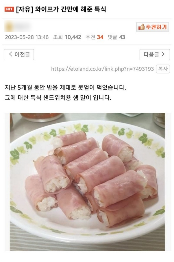 비회원 이슈 0 11 10.04 17:00 와이프가 간만에 해준 특식 눙물 ㅜ 출처 : https://m.bboom.naver.com/best/get?boardNo=9&postNo=4328818 이 글을 SNS로 공유하기