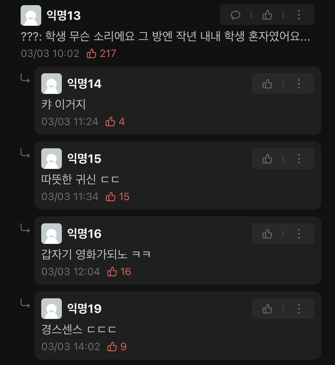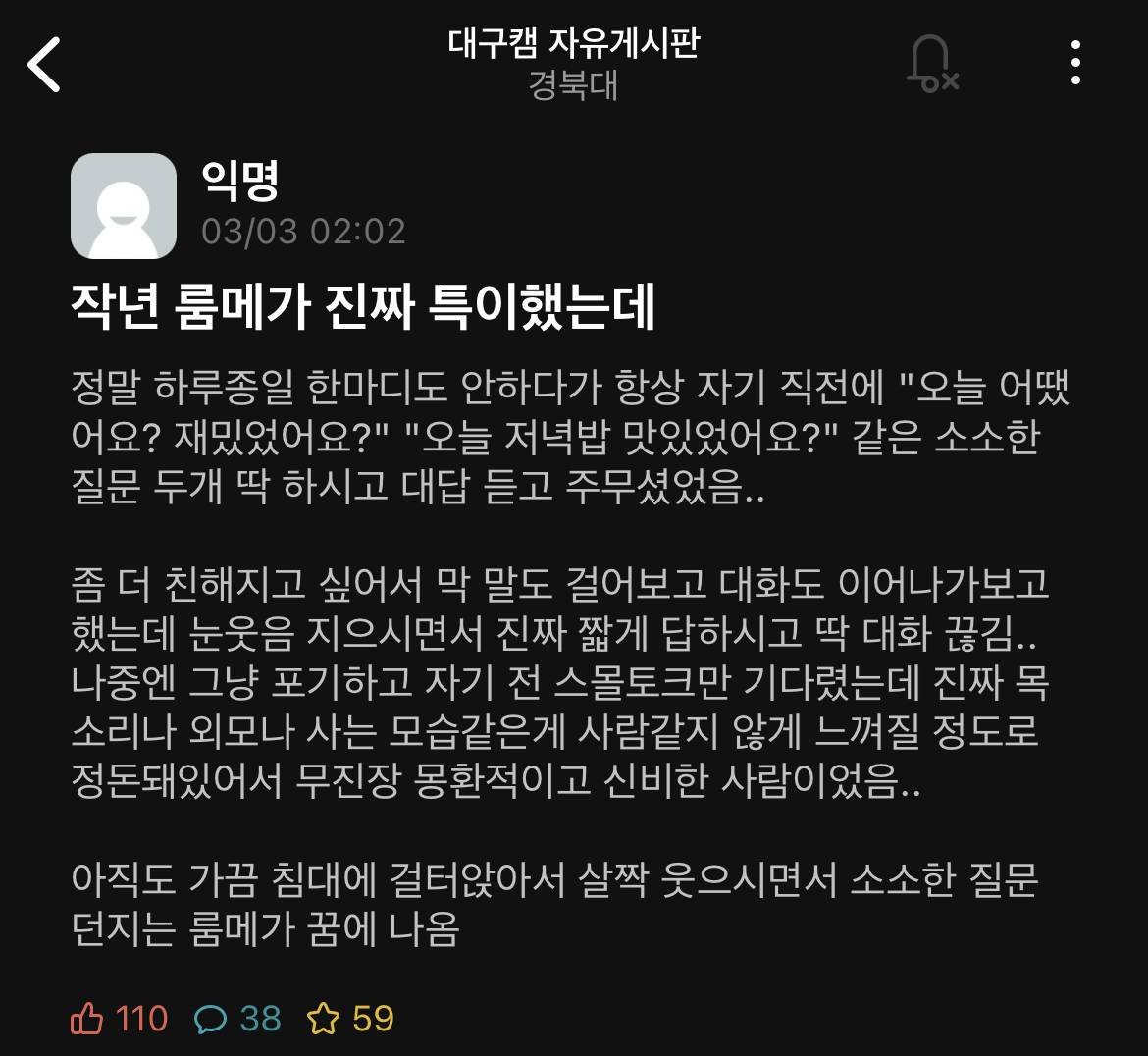비회원 이슈 0 15 10.04 17:00 기숙사 생활하던 시절 룸메이가 특이해서 기억에 남은 어느 대학생 댓글로 완성된 글ㅋㅋㅋㅋㅋㅋ 출처 : https://m.bboom.naver.com/best/get?boardNo=9&postNo=4331123 이 글을 SNS로 공유하기