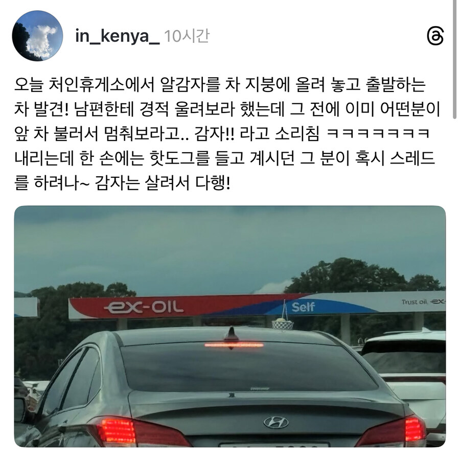 비회원 이슈 0 9 10.05 17:00 휴게소 알감자 사고.jpg ㅋㅋㅋㅋㅋ알감자 구조 성공 ㅋㅋㅋㅋㅋㅋ 출처 : https://m.bboom.naver.com/best/get?boardNo=9&postNo=4334041 이 글을 SNS로 공유하기