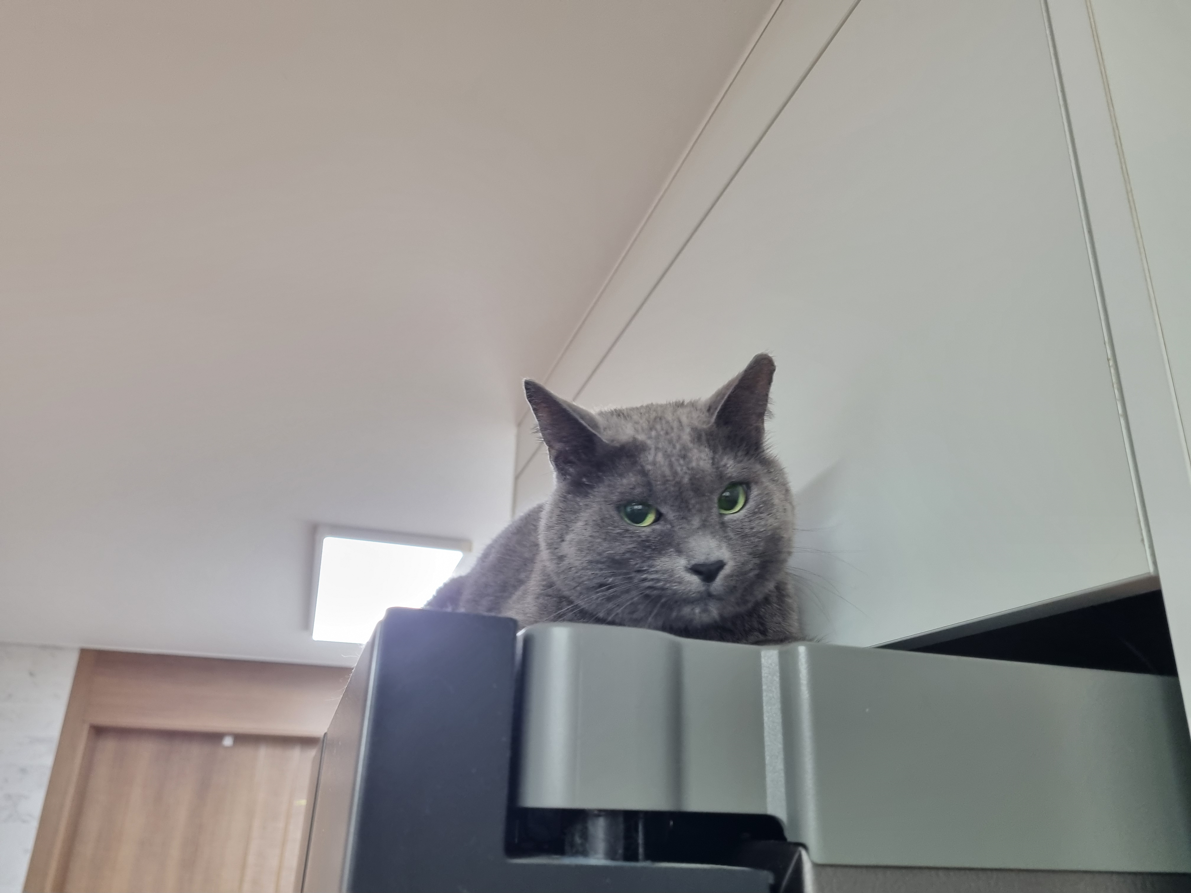 청소기소리 피해 냉장고 위로 피신. 다 기여워....♡♡♡