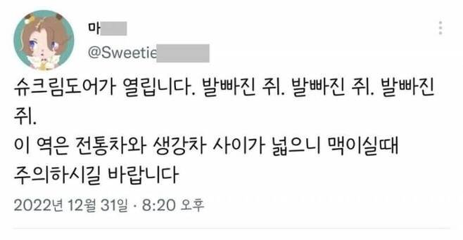 비회원 이슈 0 0 10.10 17:00 지하철 탈 때마다 듣는 소리 ㅋㅋㅋㅋㅋㅋㅋㅋㅋ 출처 : https://m.bboom.naver.com/best/get?boardNo=9&postNo=4332664 이 글을 SNS로 공유하기