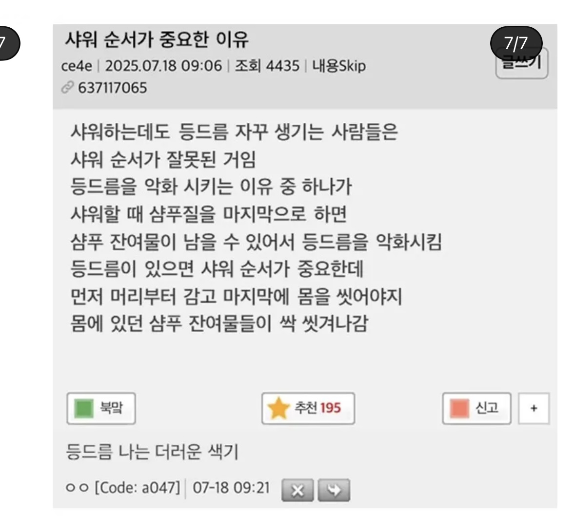 비회원 이슈 0 1 6시간전 샤워할 때 주의해야하는 거 출처 : https://m.bboom.naver.com/best/get?boardNo=9&postNo=4337627 이 글을 SNS로 공유하기