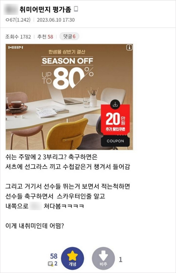 비회원 이슈 0 2 10.12 17:00 고상한 취미 ㅋㅋㅋㅋㅋㅋㅋㅋㅋ 이런 이상하고 재밌는 취미 가진 사람들 좀 있는듯ㅋㅋㅋㅋ 출처 : https://m.bboom.naver.com/best/get?boardNo=9&postNo=4332161 이 글을 SNS로 공유하기