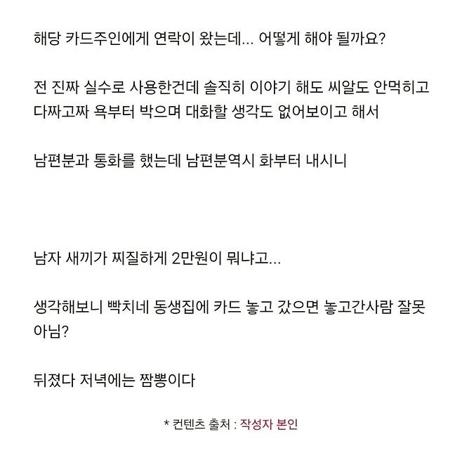 비회원 이슈 0 0 5시간전 실수로 주운 카드로 치킨 시킨 남자 친누나 카드 썼으니 친누나는 쌍욕하고 매형은 고작 그거 쓴 거냐고 다른 의미?로 화냄 ㅋㅋㅋㅋㅋㅋㅋㅋ 출처 : https://m.bboom.naver.com/best/get?boardNo=9&postNo=4332372 이 글을 SNS로 공유하기