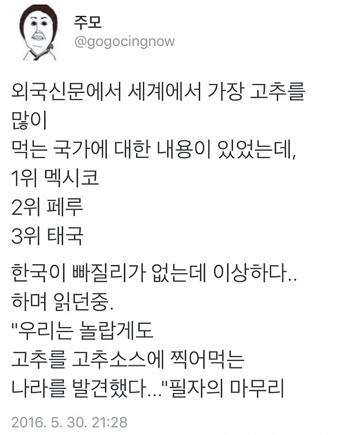 비회원 이슈 0 5 9시간전 세계에서 고추를 가장 많이 먹는 나라에 한국이 없음 앜ㅋㅋㅋㅋㅋㅋㅋㅋㅋㅋㅋㅋㅋㅋㅋㅋㅋ 출처 : https://m.bboom.naver.com/best/get?boardNo=9&postNo=4338460 이 글을 SNS로 공유하기