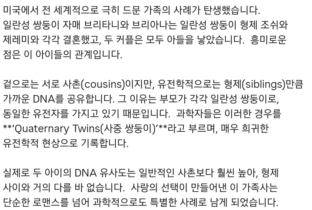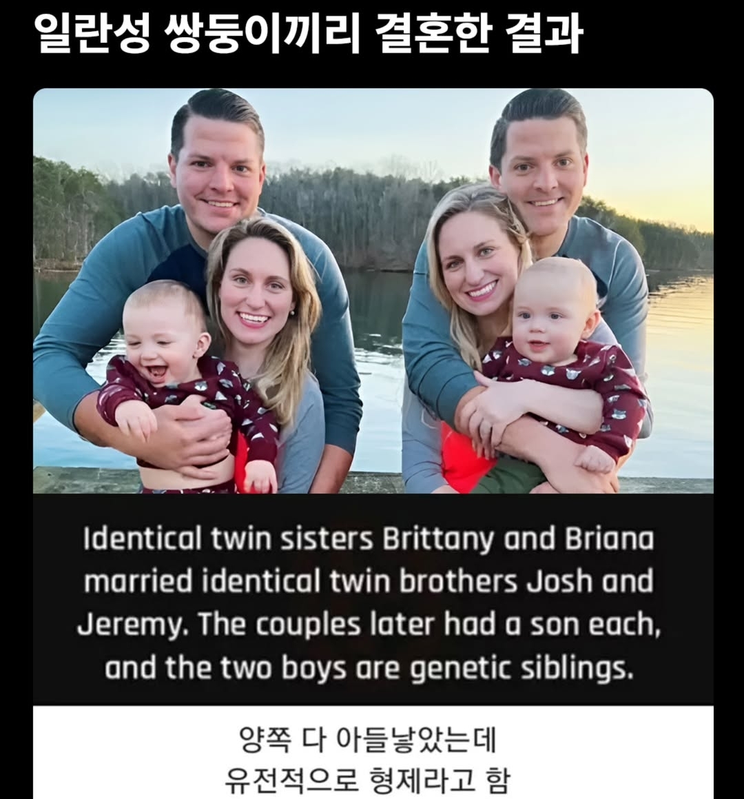 비회원 이슈 0 4 16시간전 일란성 쌍둥이끼리 결혼해서 애를 낳은 결과 신기합니다!!! 출처 : https://m.bboom.naver.com/best/get?boardNo=9&postNo=4335976 이 글을 SNS로 공유하기