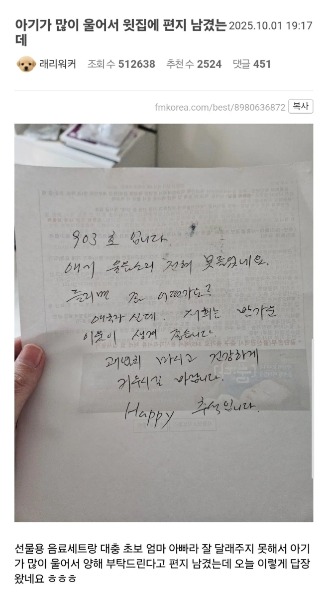 비회원 이슈 0 15 10.28 17:00 아기가 많이 울어서 윗집에 편지 남겼는데 받은 답장.jpg 후아 인류애 충전 ???????? 출처 : https://m.bboom.naver.com/best/get?boardNo=9&postNo=4339104 이 글을 SNS로 공유하기