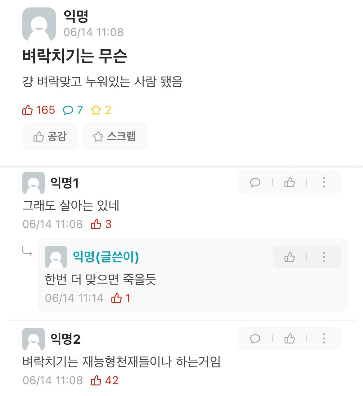 비회원 이슈 0 14 10.28 17:00 시험공부 벼락치기는 무슨 그 벼락 저도 종종 맞았죠 ㅋㅋㅋㅋ 출처 : https://m.bboom.naver.com/best/get?boardNo=9&postNo=4336605 이 글을 SNS로 공유하기