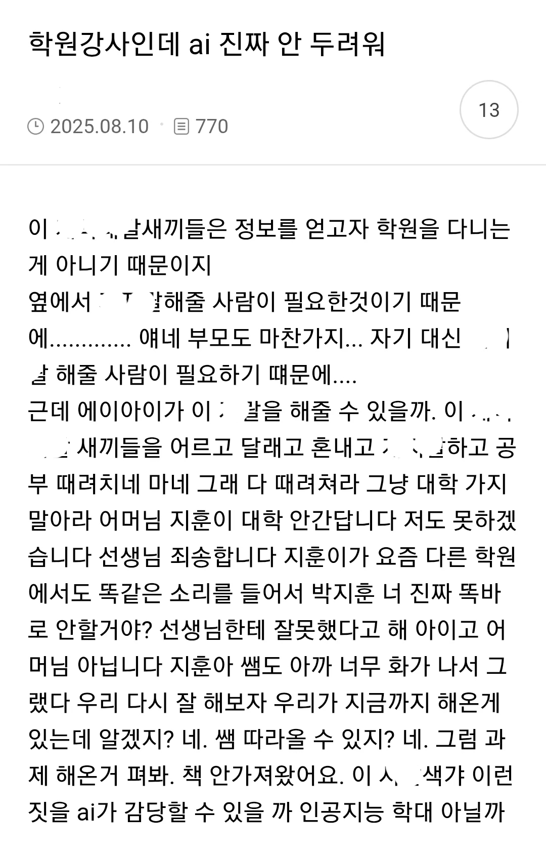 비회원 이슈 0 17 10.28 17:00 학원강사인데 ai 진짜 안 두려워 ai도 빡칠듯 ㅋㅋㅋ 출처 : https://m.bboom.naver.com/best/get?boardNo=9&postNo=4336272 이 글을 SNS로 공유하기