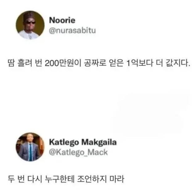 비회원 이슈 0 3 11.01 17:00 땀 흘려 번 200만원이 공짜 1억보다 더 값지다 출처 : https://m.bboom.naver.com/best/get?boardNo=9&postNo=4343214 이 글을 SNS로 공유하기