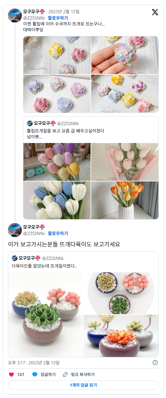 비회원 이슈 0 2 5시간전 이젠 튤립에 이어 수국까지 뜨개로 뜨는구나..대박 이뿌다...twt 출처 : https://m.bboom.naver.com/best/get?boardNo=9&postNo=4339001 이 글을 SNS로 공유하기