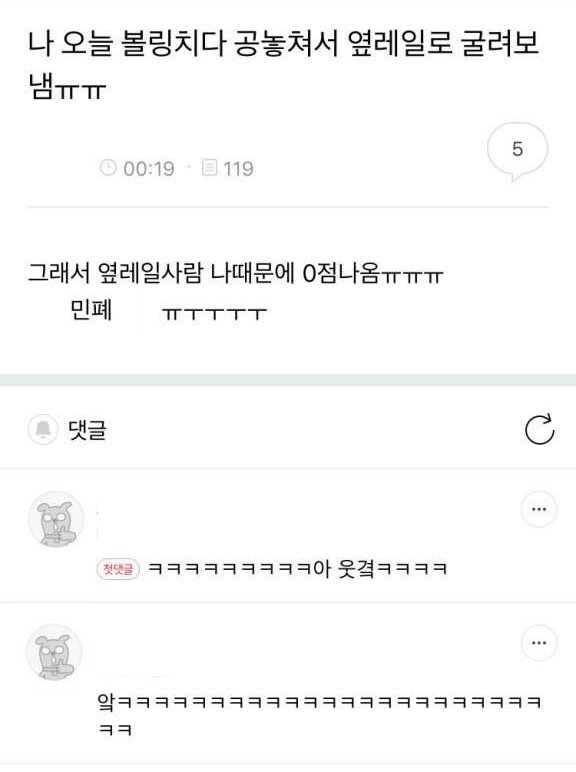 비회원 이슈 0 2 11.12 17:00 나 오늘 볼링장에서 볼링 치다 공 놓쳐서 헐퀴ㅜㅜ ㅋㅋㅋㅋㅋ 출처 : https://m.bboom.naver.com/best/get?boardNo=9&postNo=4336602 이 글을 SNS로 공유하기