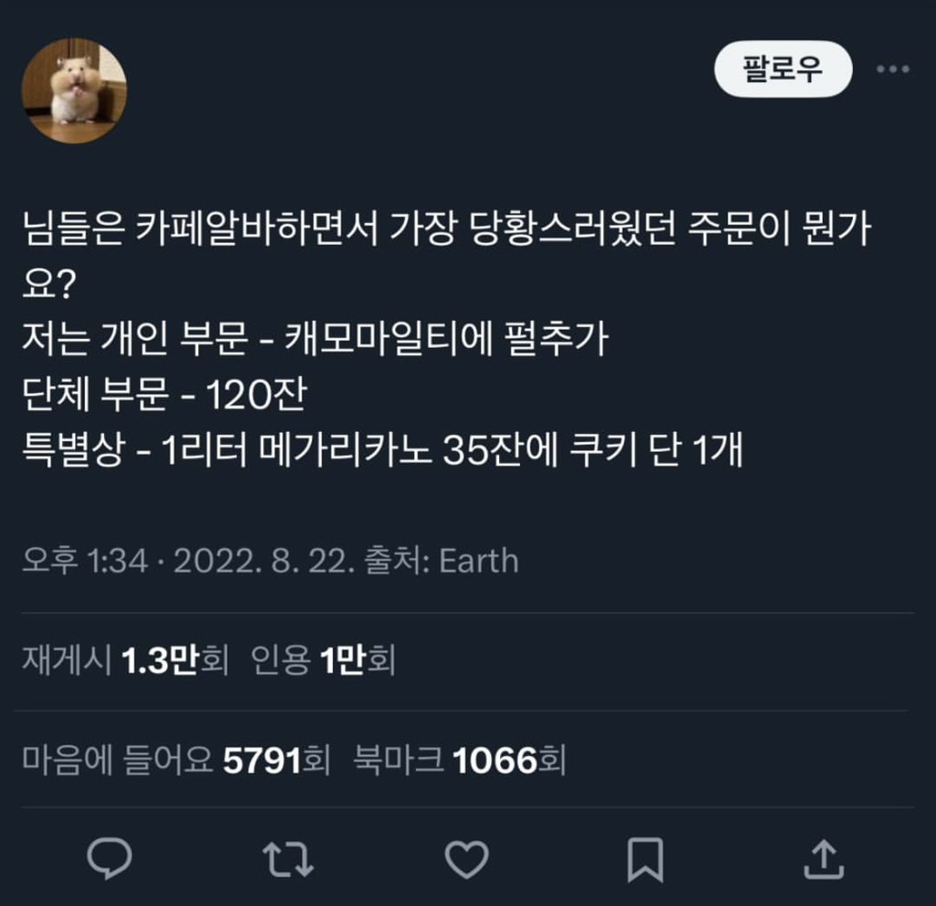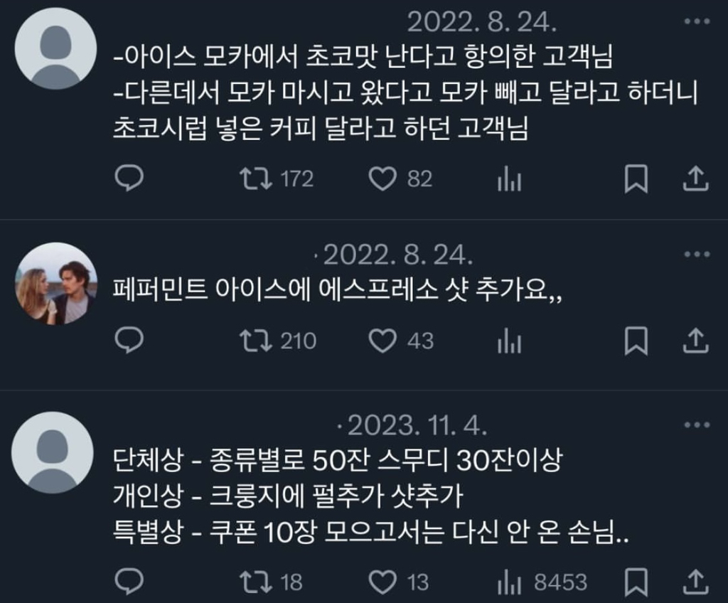 비회원 이슈 0 4 6시간전 카페 아르바이트생들이 받은 황당한 주문 모음. jpg 출처 : https://m.bboom.naver.com/best/get?boardNo=9&postNo=4343173 이 글을 SNS로 공유하기