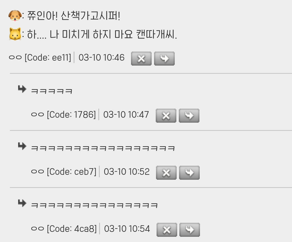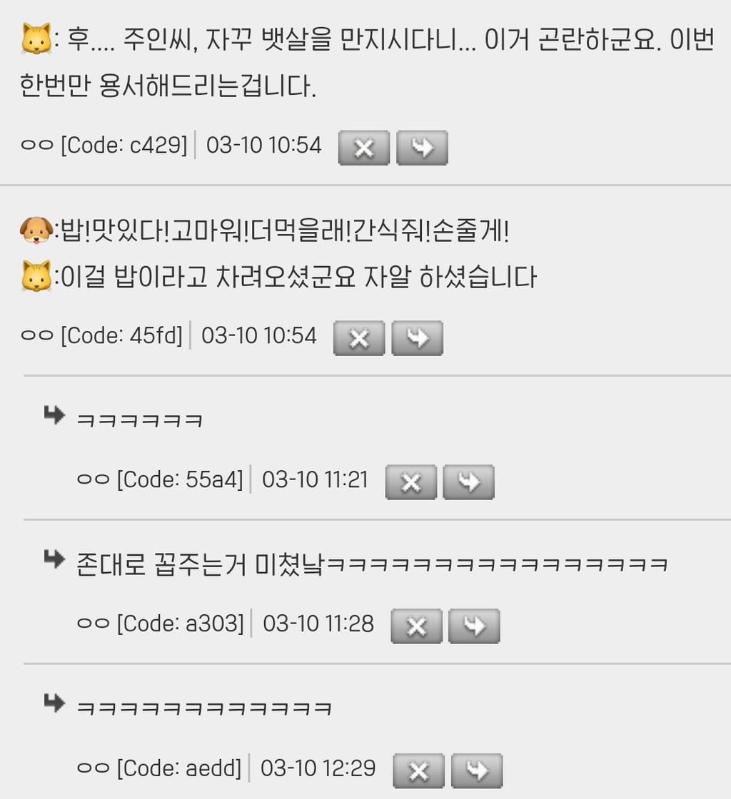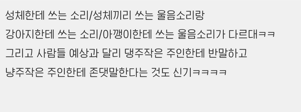 비회원 이슈 0 3 6시간전 강아지는 주인에게 반말을 하고 고양이는 의외로 존대말을 쓴다 뭔가 상상하니 귀엽군요 ㅋㅋ 출처 : https://m.bboom.naver.com/best/get?boardNo=9&postNo=4344380 이 글을 SNS로 공유하기