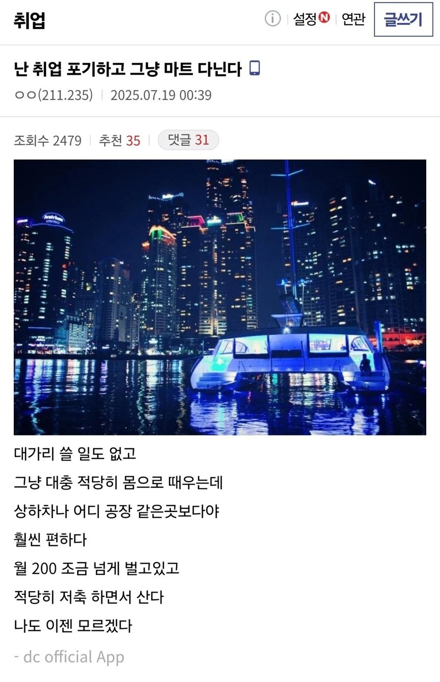 비회원 이슈 0 3 11.14 17:00 난 취업 포기하고 그냥 마트 다닌다 파이팅입니다 출처 : https://m.bboom.naver.com/best/get?boardNo=9&postNo=4344885 이 글을 SNS로 공유하기
