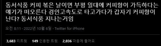 비회원 이슈 0 1 2시간전 부평 일대에 커피향이 가득하다는 날 오홍 ㅋㅋㅋ 출처 : https://m.bboom.naver.com/best/get?boardNo=9&postNo=4342252 이 글을 SNS로 공유하기