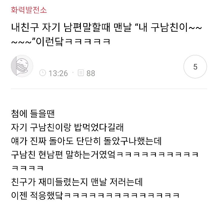 비회원 이슈 0 2 11.17 17:00 유부녀 친구가 자꾸 구남친 이야기한다 현남편 ㅋㅋㅋ 출처 : https://m.bboom.naver.com/best/get?boardNo=9&postNo=4344880 이 글을 SNS로 공유하기