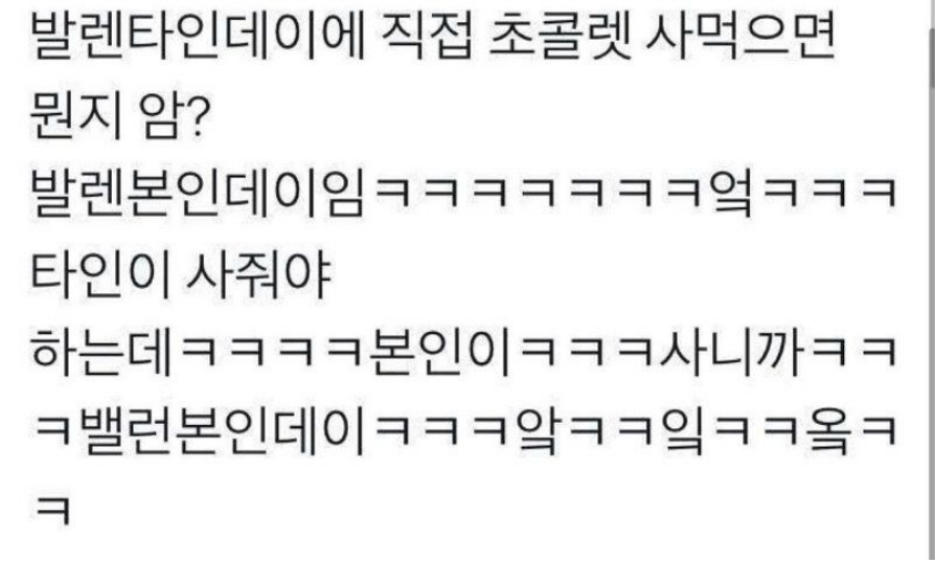 비회원 이슈 0 0 3시간전 발렌타인데이에 직접 초콜렛 사먹으면 뭔지 알아? ㅋㅋㅋㅋㅋㅋㅋㅋㅋㅋㅋㅋㅋㅋ어이없어서 터짐 출처 : https://m.bboom.naver.com/best/get?boardNo=9&postNo=4346872 이 글을 SNS로 공유하기