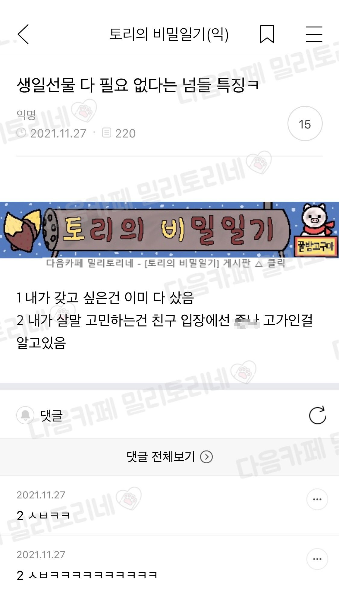비회원 이슈 0 0 11.28 17:00 생일선물 진짜 필요 없다는 사람 특징.jpg ㅋㅋㅇㅇㅋㅋㅋ둘다 해당됨..ㅋㅋㅋㅋㅋㅋㅋㅋㅋㅋㅋ 출처 : https://m.bboom.naver.com/best/get?boardNo=9&postNo=4347817 이 글을 SNS로 공유하기