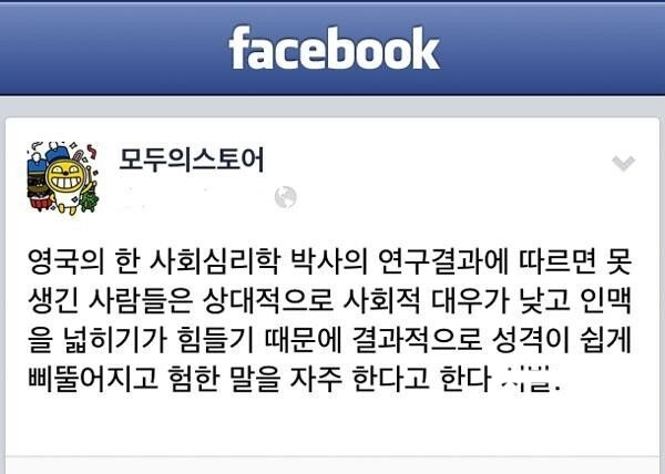 비회원 이슈 0 0 6시간전 못생긴 사람의 심리 특징 아.. 그래서 내가... ㅜ 출처 : https://m.bboom.naver.com/best/get?boardNo=9&postNo=4345309 이 글을 SNS로 공유하기