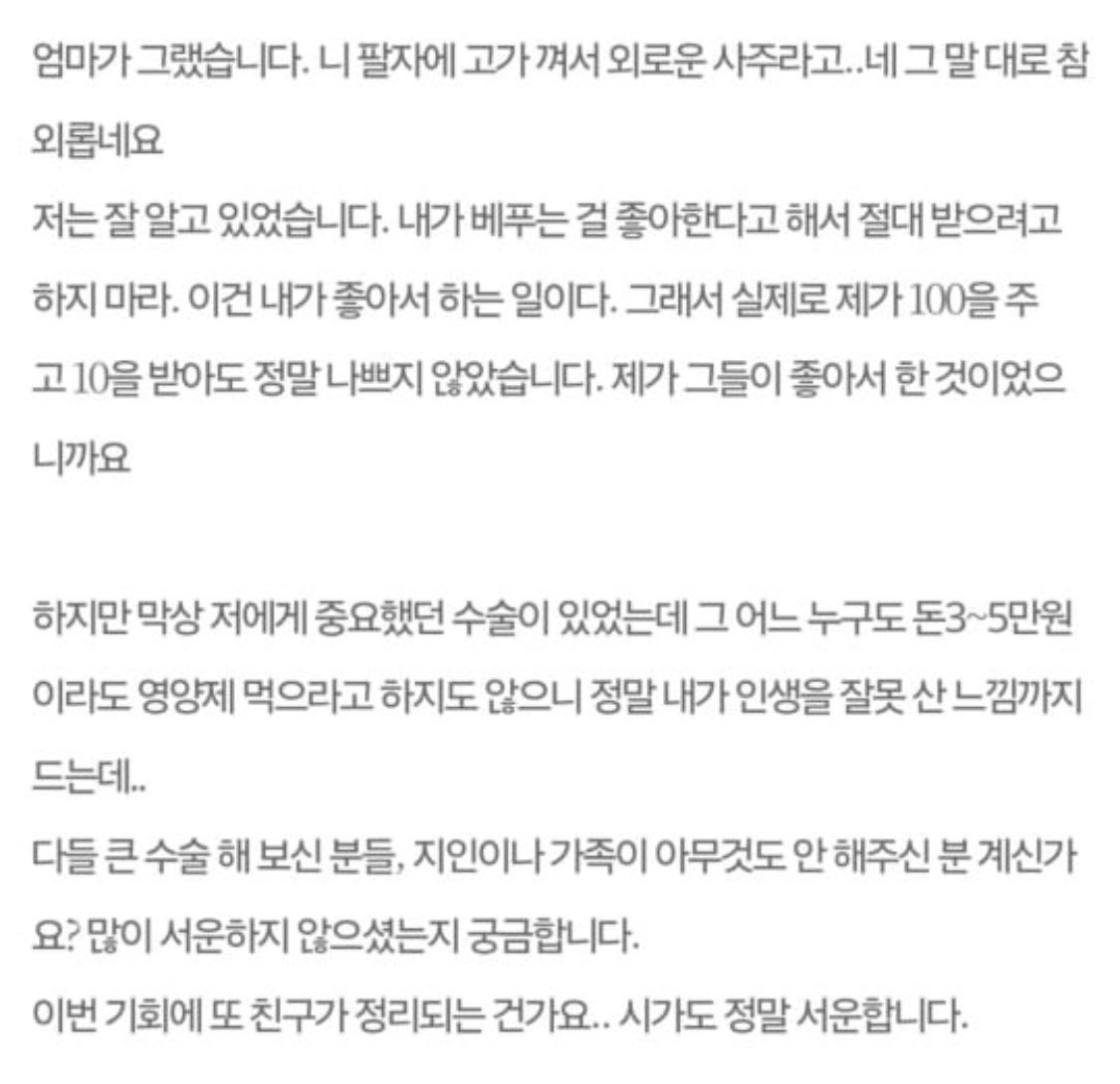 비회원 이슈 0 0 5시간전 큰 수술을 했는데 챙겨주는 사람이 아무도 없네요 너무 서운하셨겠는데요 ㅠ 출처 : https://m.bboom.naver.com/best/get?boardNo=9&postNo=4348776 이 글을 SNS로 공유하기